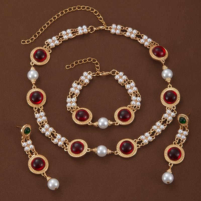 European and American Geometric Imitation Pearl Pendant Necklace, Earring Bracelet, Women's Classic Trendy Jewelry Set
