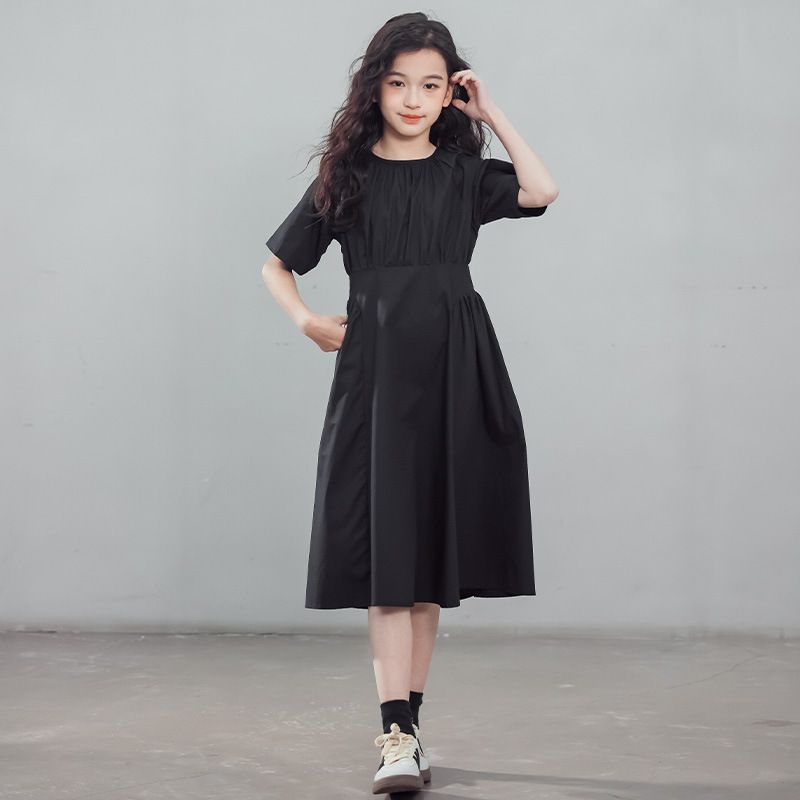 Girls' Fashion Short-Sleeve Shirt Dress Summer Children's Elegant Waist-Cinched Dress