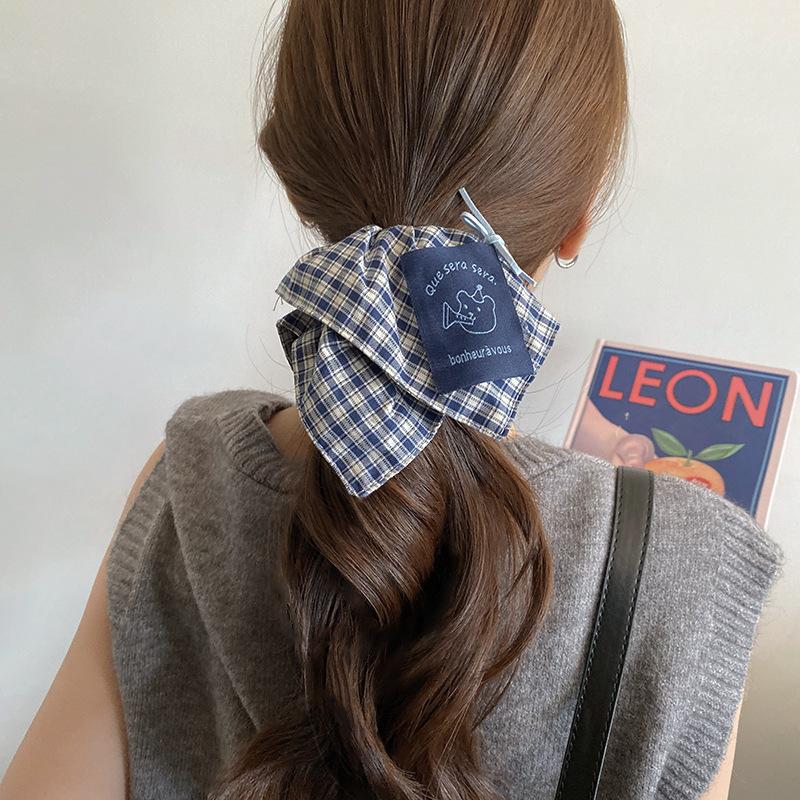 Retro style small fresh blue plaid square scarf hair band female cute bear ribbon bow fabric hair accessories