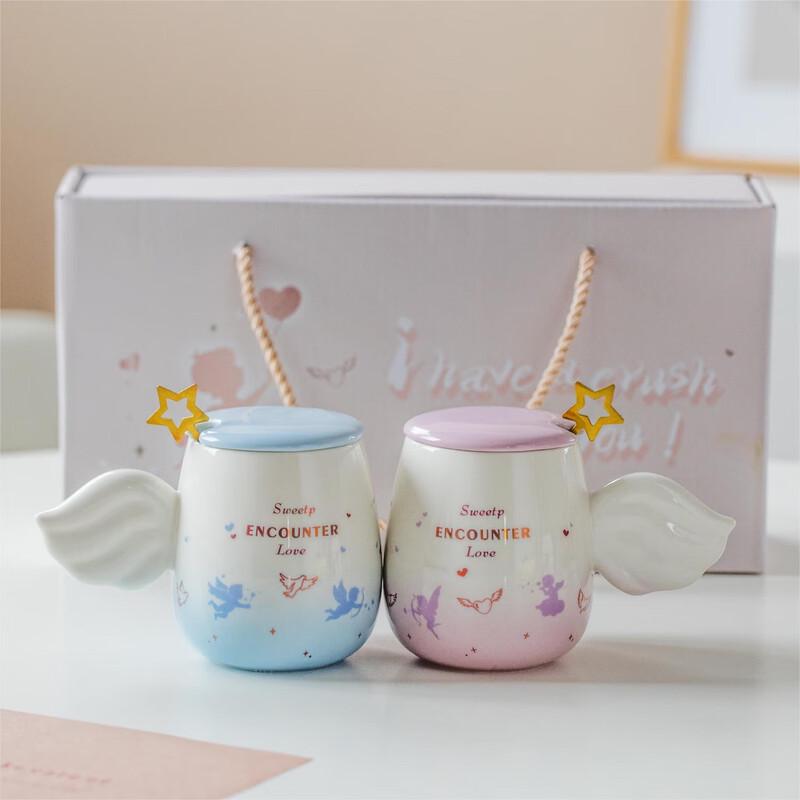 Couple's Ceramic Mugs Gift Set with Lids and Spoons