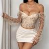 Damen Off-Shoulder Korsett Tops Trendige Floral Bestickte Mesh Langarm Crop Tops