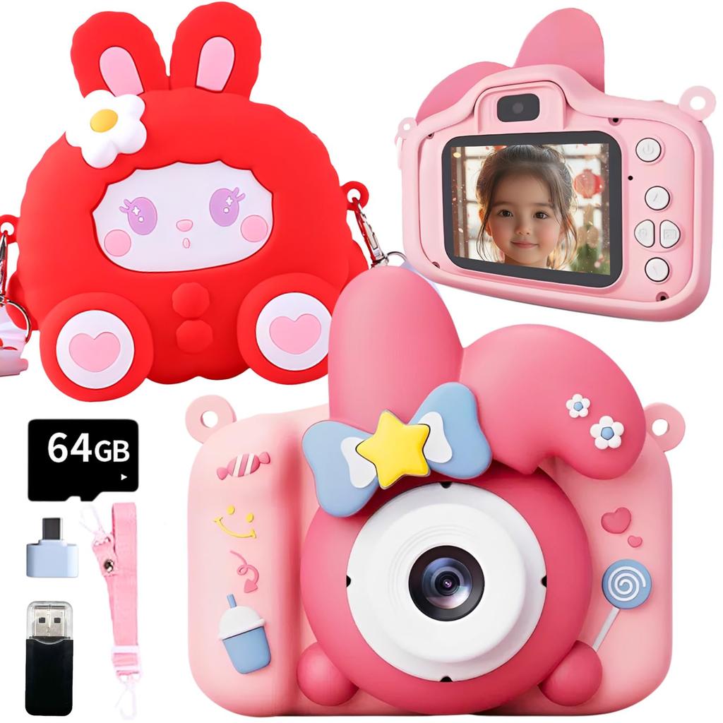 Popoma Rabbit Kinderkamera Spielzeug mit 64GB Speicher und Tasche, 48MP 1080P HD, Japanische Bedienungsanleitung, Spielfunktion, Weihnachtsgeschenk für Mädchen, Rosa