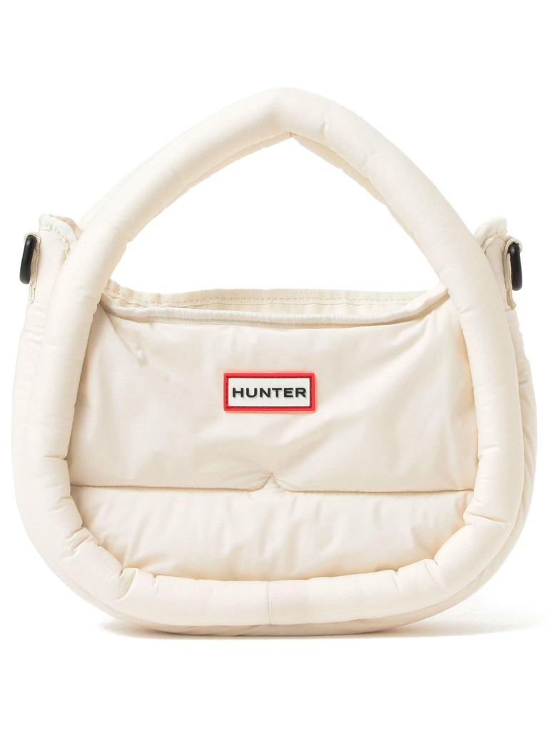 This hobo bag features a soft, cushion-like texture. Its new half-moon silhouette makes it perfect for everyday use. The handles and the entire bag are crafted from voluminous puffer material. The front is accented with a HUNTER PVC logo.