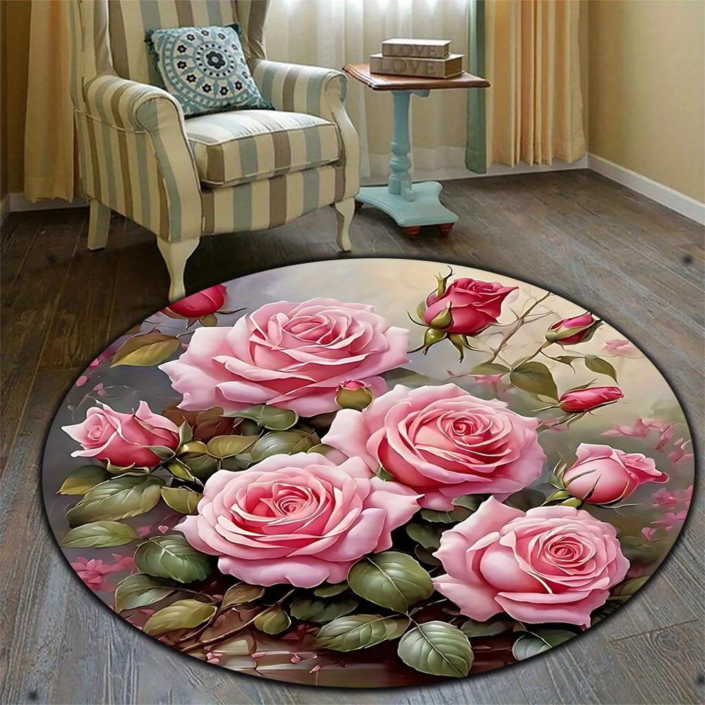 1pc Elegant Rose-Themed Circular Area Mat, Washable Polyester Floor Mat with Lush Floral Design for Living Room, Bedroom, Kitche