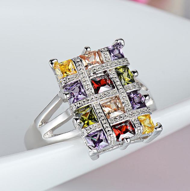 Modischer bunter CZ-Kristall Sterling-Silber Quadratische Breite Party-Fingerring für Damen Hochzeits-Verlobungsringe