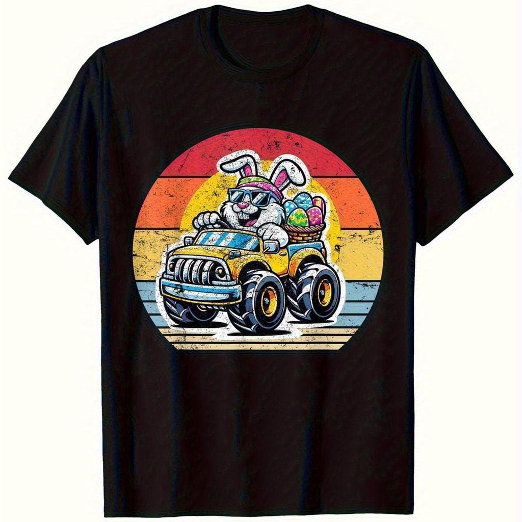 Hase Monster Truck Grafik T-Shirt Herren Kurzarm Baumwolle Rundhals Ostern Lässig Geschenk Shirt