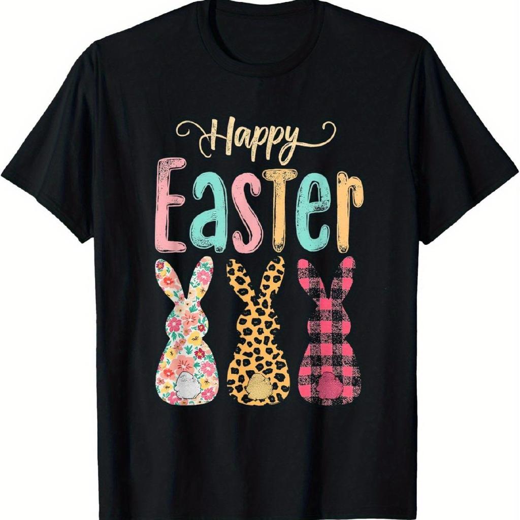 Retro Happy Easter Bunny Floral Leopard Plaid Graphic Tee Soft Cotton Casual T-Shirt for Men