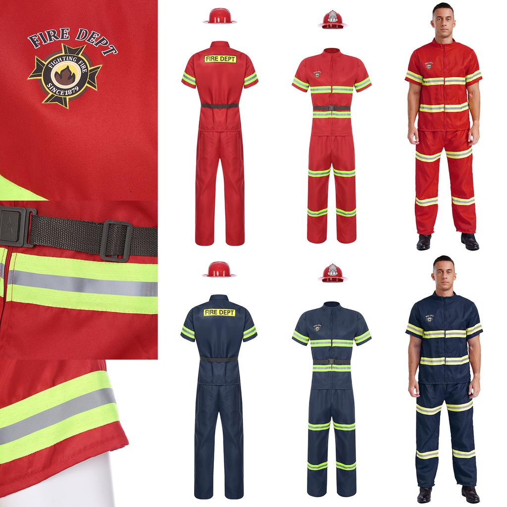 Herren Feuerwehrmann Kostüm Set 4-teilig Plastikhelm Kurzarmjacke Hose Gürtel Reflektierende Streifen
