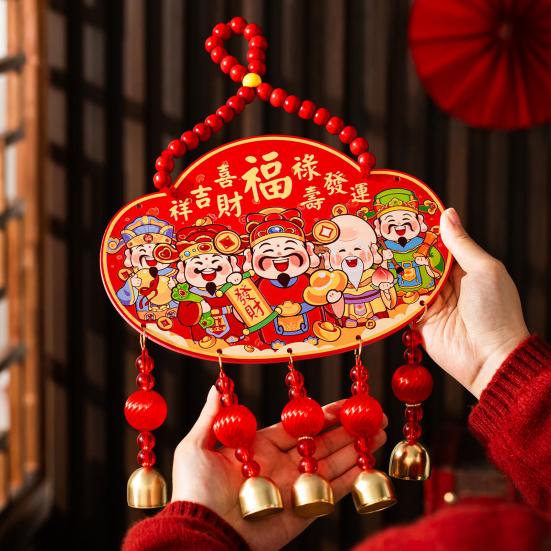 Feiern Sie das Neue Jahr mit diesem exquisiten Türschild, gefertigt mit Liebe zum Detail und reicher Textur.. Mit leuchtend roten Perlenketten und eleganten Kupferglocken- und Münzquasten bietet es einen schönen, beschwerten Look, wenn es aufgehängt wird.. Dieses Zeichen symbolisiert Glück und sammelt Segen für Reichtum, Glück und Glück, was es zu einer bedeutungsvollen Dekoration für die festliche Jahreszeit macht..