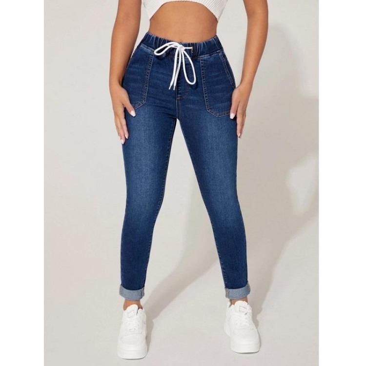 High Waist Stretch Denim Jeans für Damen mit Kordelzug Taille Bleistifthose Pantalones De Mujer