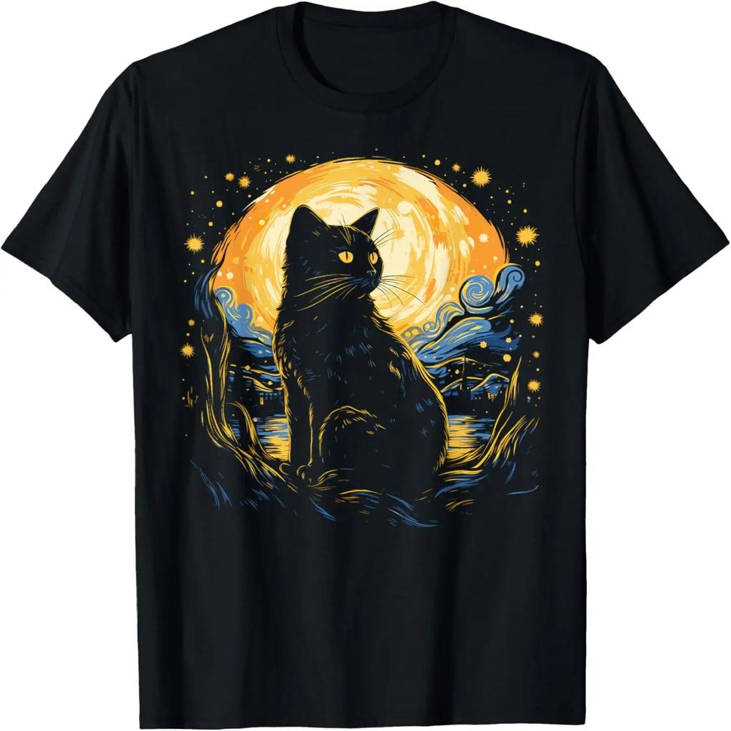 Art Van Gogh Sternennacht Schwarze Katze für Katzenliebhaber Mama Papa T-Shirt