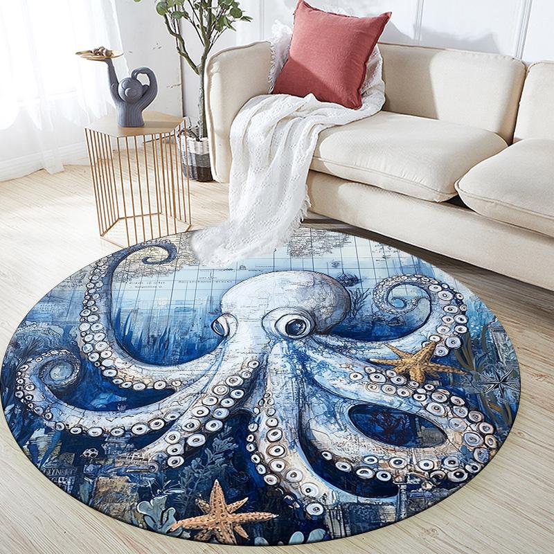 Aquarell-Oktopus,Runder Teppich,Teppich für Wohnzimmer Schlafzimmer Sofa Spielzimmer Dekor,Rutschfeste Fußmatte