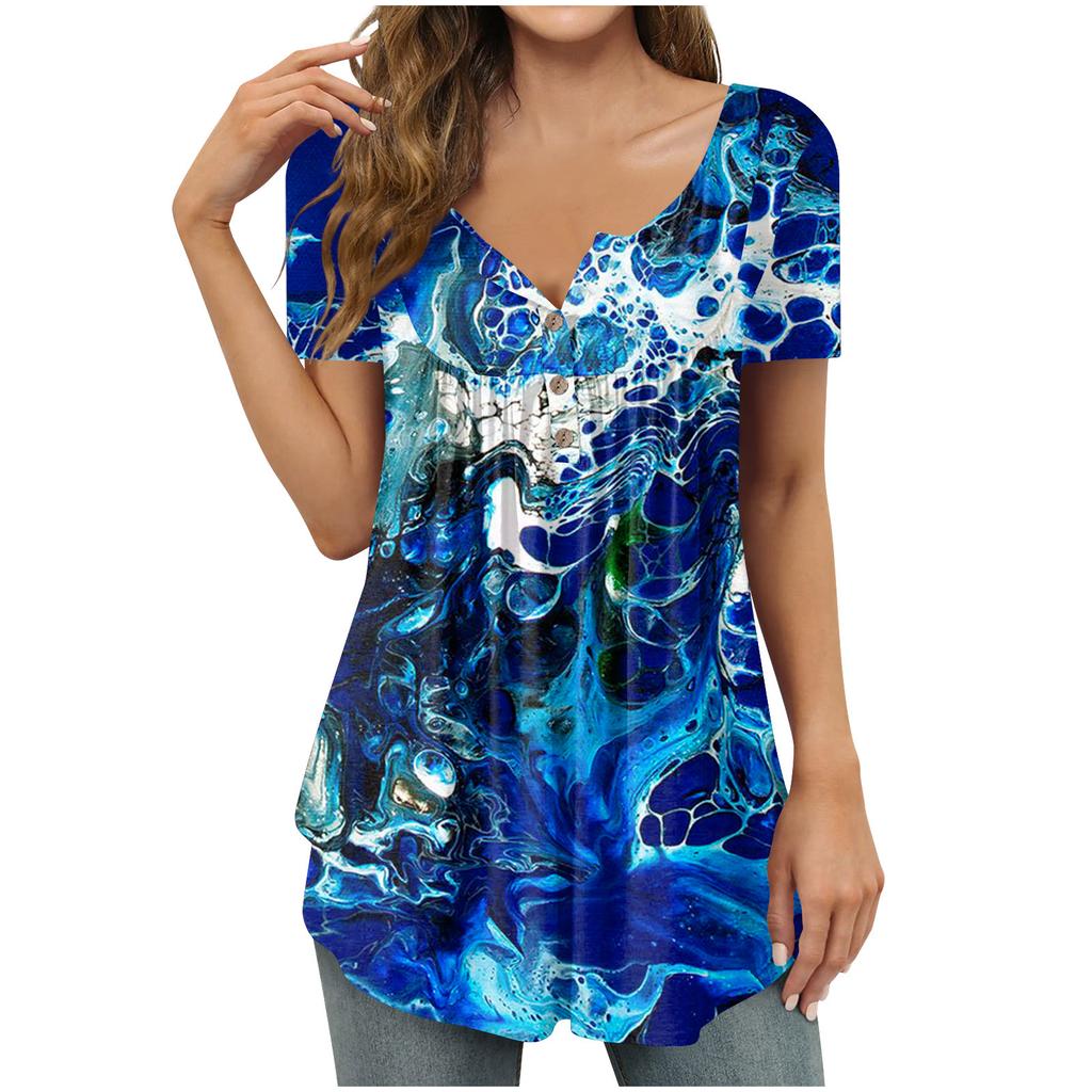 Women's Fashion Casual Print Short Sleeve Button V Neck Loose T-Shirt Top