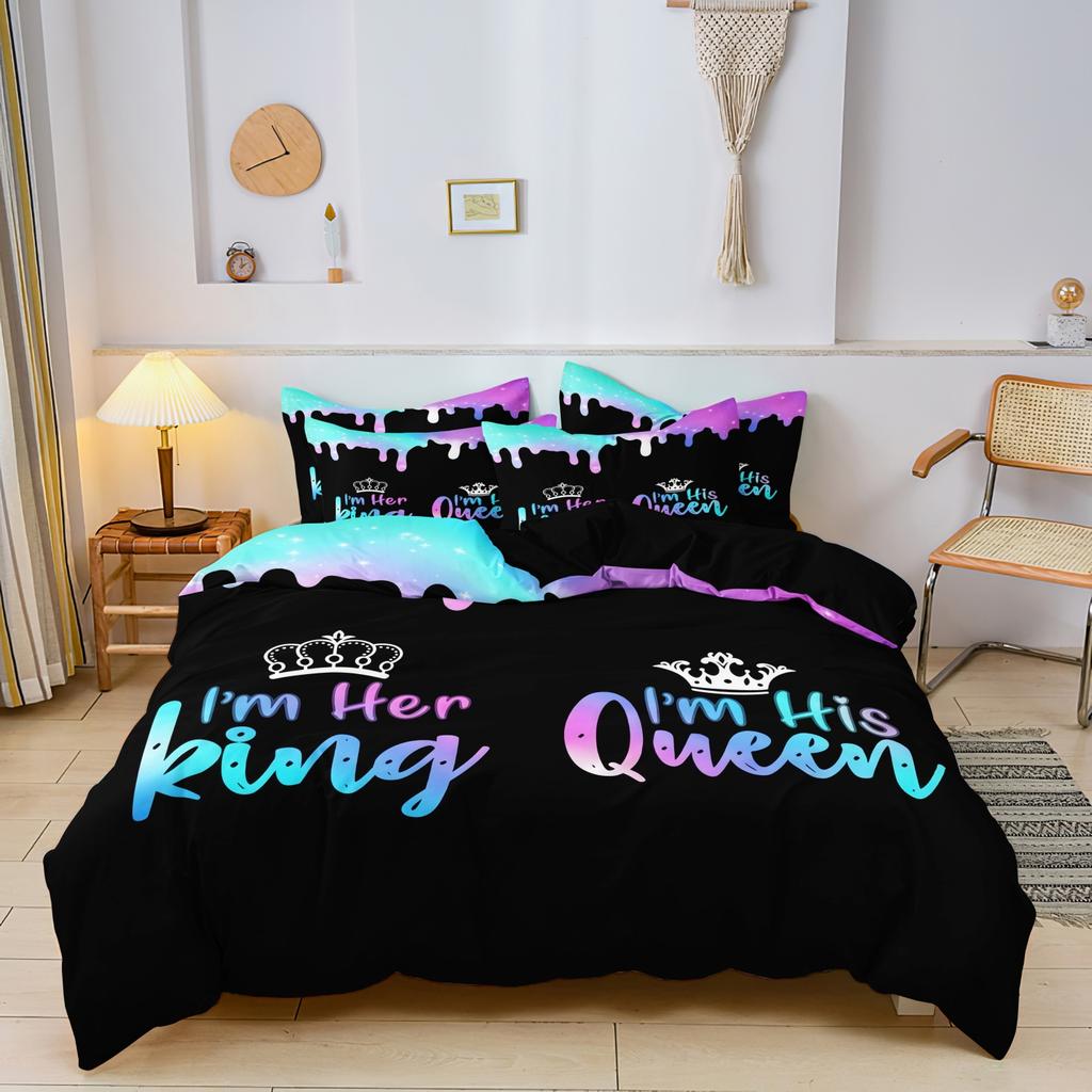 3pcs Valentine'S Day Romantic couple Crown Letter Duvet Cover Set (1 Duvet Cover + 2 Pillowcases No Core) for Home And Dorm Use