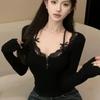 Autumn Sweet Lace Stitching V-neck Skinny Pink Coquette Aesthetic Slim-fit Long Sleeve T-shirts Cute Casual Tees Women Goth