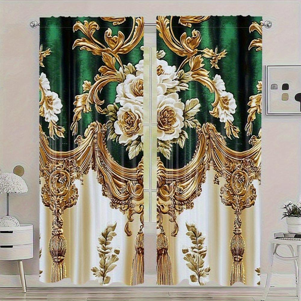 2pcs Elegant Gold Floral Print Polyester Curtains with Green & Gold Damask Design for Bedroom Living Room Kitchen & Office Decor