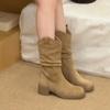 Windfalten-Stapelstiefel mattes Leder weites Röhrenbein dicker Absatz V-Ausschnitt Western-Cowboy-Stiefel