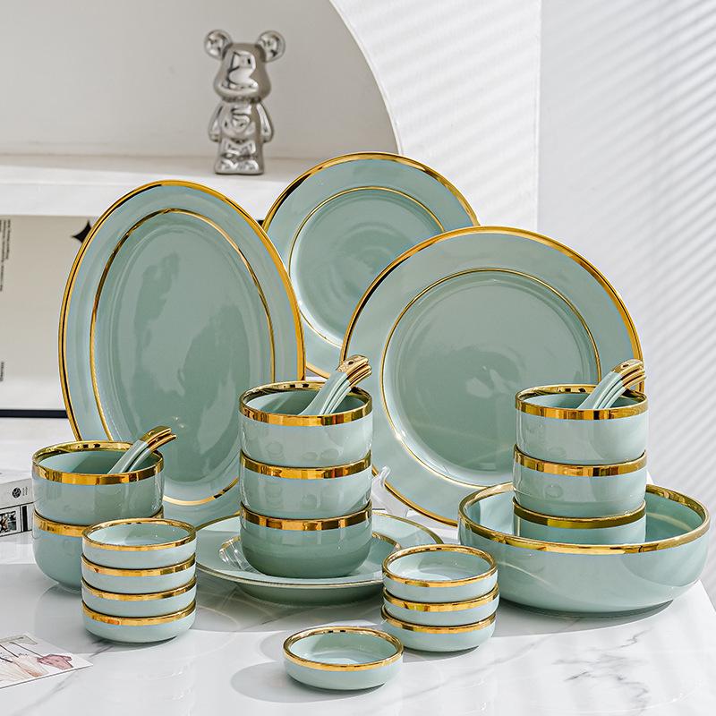Keramik Geschirrset im nordischen Stil: Elegante Teller, Schalen & Essstäbchen mit Goldrand