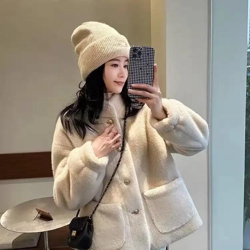 Women's Short Beige Teddy Faux Fur Coat Button-Up Warm Winter Jacket Casual Streetwear