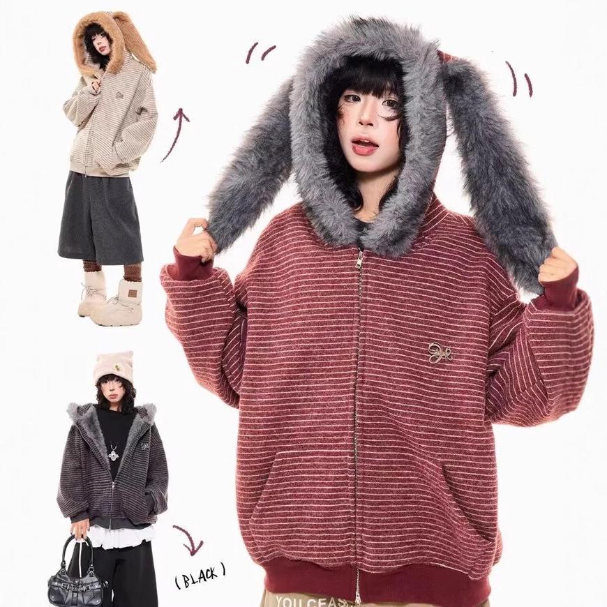 Koreanischer Stil Kapuzen-Kaninchenohr Plüsch Damen Strickware – Gestreift Unisex Lockerer Schnitt mit Herbst/Winter Samt.