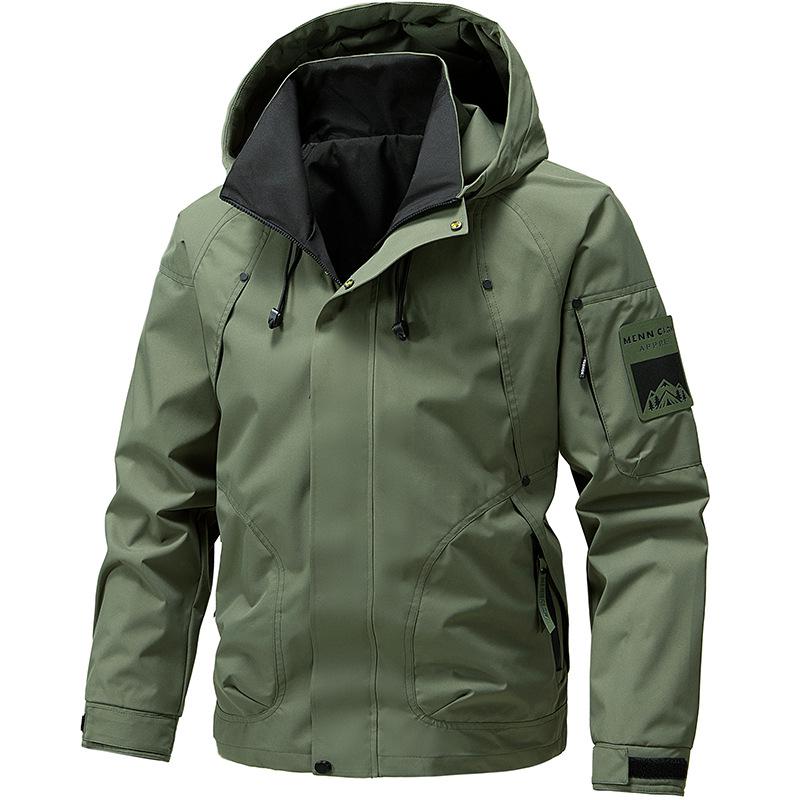 Diese trendige und vielseitige Herrenjacke ist für lässiges Bergsteigen und im Arbeitskleidungsstil konzipiert.. Hergestellt aus Polyester, verfügt es über ein einfarbiges Muster mit Stehkragen.. Die dünne, langärmelige Jacke ist wasserdicht und somit ideal für Frühlingsbedingungen.. Die Kapuze bietet eine zusätzliche Schutzschicht, während das Mischgewebe aus Chemiefasern für das Kunstfellfutter für Komfort und Strapazierfähigkeit sorgt.. Perfekt für Outdoor-Aktivitäten oder Freizeitkleidung, kombiniert diese Jacke Praktikabilität mit einer modernen Ästhetik.