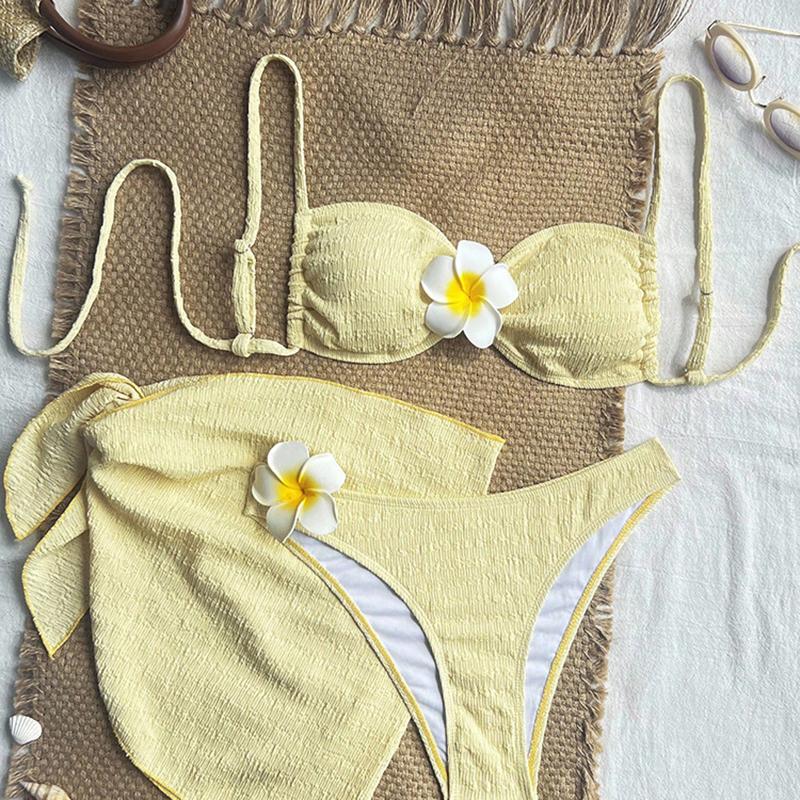 Sexy Gelbes 3D-Blumen-Bikini-Set Damen Falten Push-Up High Waist Badeanzug Strandbadeanzug Cover-Up 3-teilige Badebekleidung