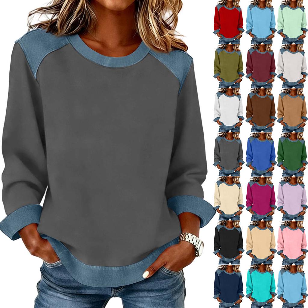 Women Denim Collar Patchwork Stitching Sweatshirt Casual Pullover Long Sleeve Shirts
