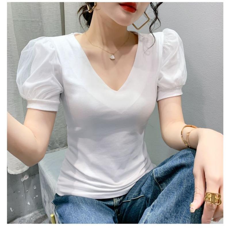 Damen Weiß V-Ausschnitt Puffkurzarm Slim Fit Lässiges T-Shirt