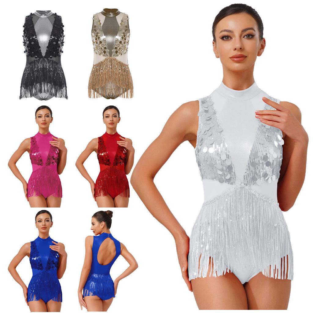 Damen Pailletten Quasten Latein Tanz Bodysuit Metallisch Glänzend Patchwork Ärmellos Rückenausschnitt Leotard Cha Cha Performance