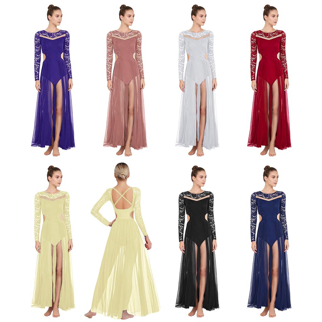 Damen Lyrical Tanzkostüm Patchwork Floral Spitze Langarm Taille Seiten Ausgeschnitten Rückenfrei Fließendes Netz Eingearbeiteter Slip Kleid