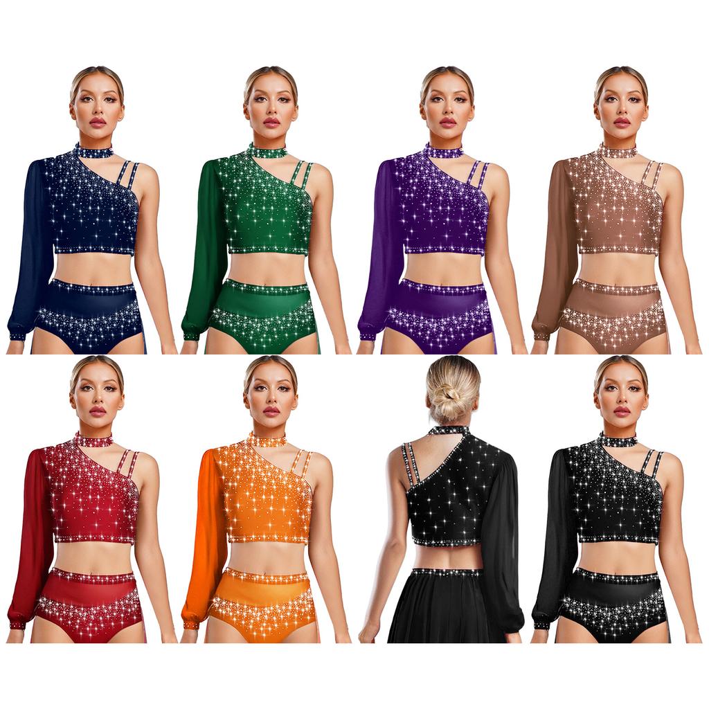 Damen Zeitgenössisches Lyrisches Tanzoberteil Asymmetrisch Durchsichtiges Netz Langarm Glänzend Bunt Strass Crop Top