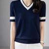 Damen Koreanischer Stil Schlankmachend Vielseitig Mode Gestricktes Oberteil Locker Farbblock V-Ausschnitt Einfarbig Kurzarm T-Shirt