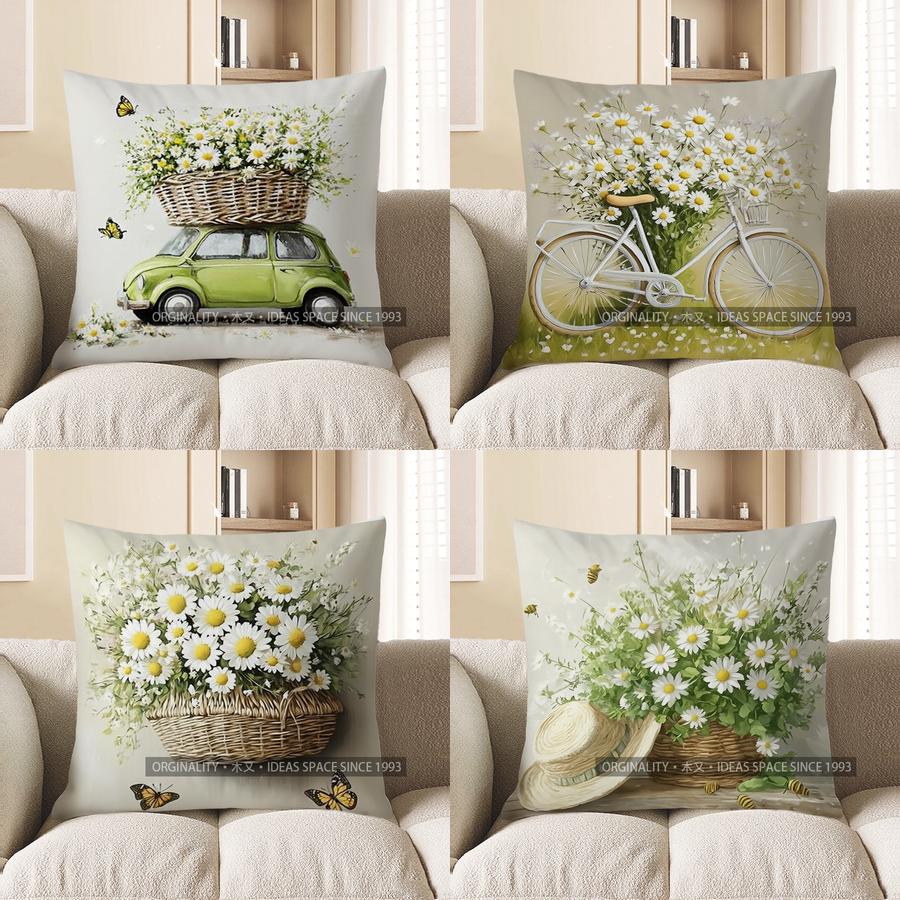 Home Decor Vintage Car With Daisy Basket Throw Pillow Pattern Cushion Cover Suitable For Sofa Bedroom Car Pillow Cover