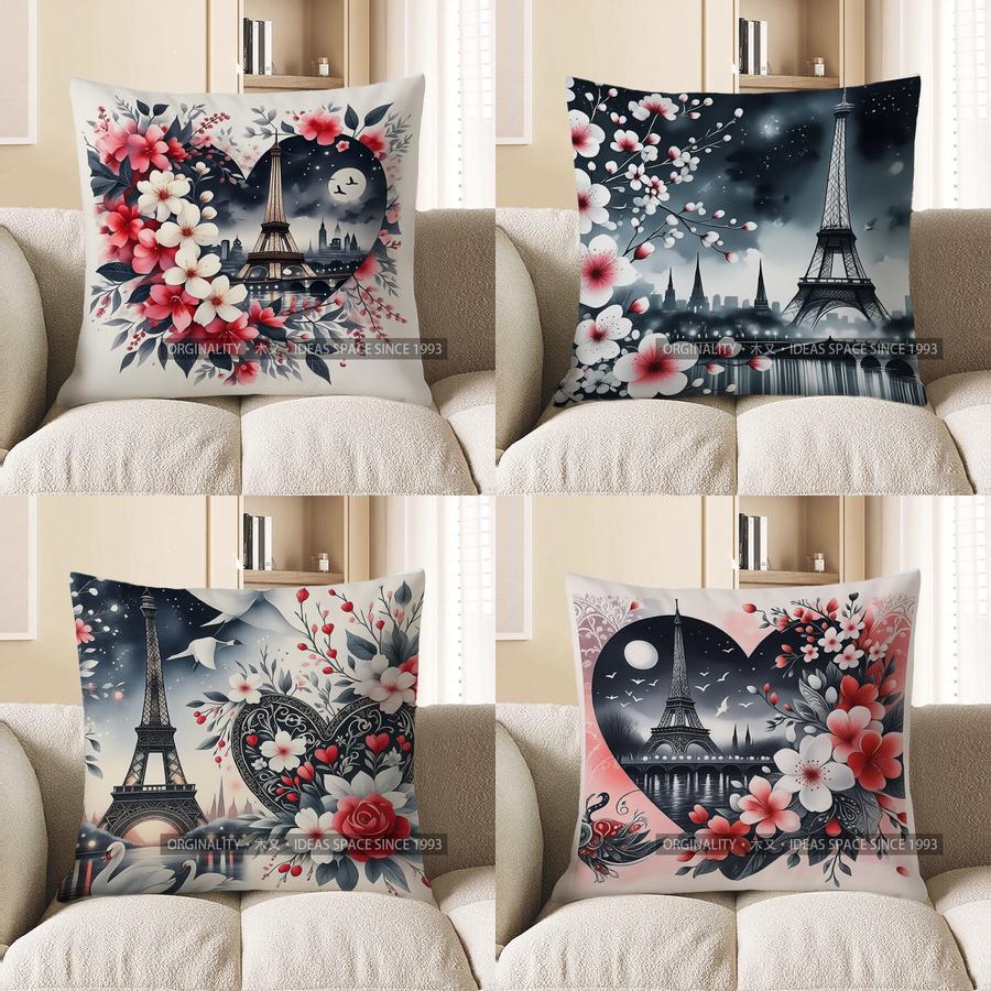 Home Decor Floral Heart With Eiffel Tower Throw Pillow Pattern Cushion Cover Suitable For Sofa Bedroom Car Pillow Cover