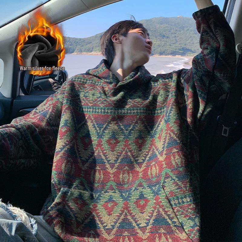 Umarme Wärme und Stil mit diesem herren Kapuzenpullover im ethnischen Stil mit Fleecefutter, ideal für die Herbst- und Wintersaison. Mit einem ausgeprägten Stehkragen und langen Ärmeln ausgestattet, bietet dieser Pullover sowohl Komfort als auch einen trendigen Look.. Hergestellt aus hochwertigem Polyester, verfügt es über ein weiches Polyesterfaser-Fleecefutter für erhöhten Komfort.. Das auffällige Hahnentrittmuster verleiht jedem Freizeit-Outfit einen Hauch von Raffinesse und macht es zu einer vielseitigen Ergänzung Ihrer Garderobe.