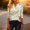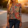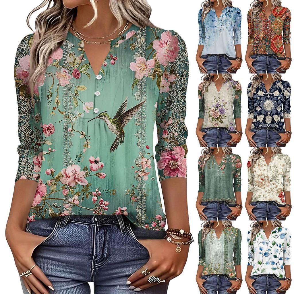 Modisches lässiges Retro-Damen-T-Shirt-Top mit Blumenmuster, V-Ausschnitt, dekorativem Knopf und Dreiviertelärmeln