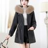 Autumn Winter Women's PU Leather Jacket Mid-length Fleece-lined Hooded Plus Size Leather Jacket with Fur Collar
