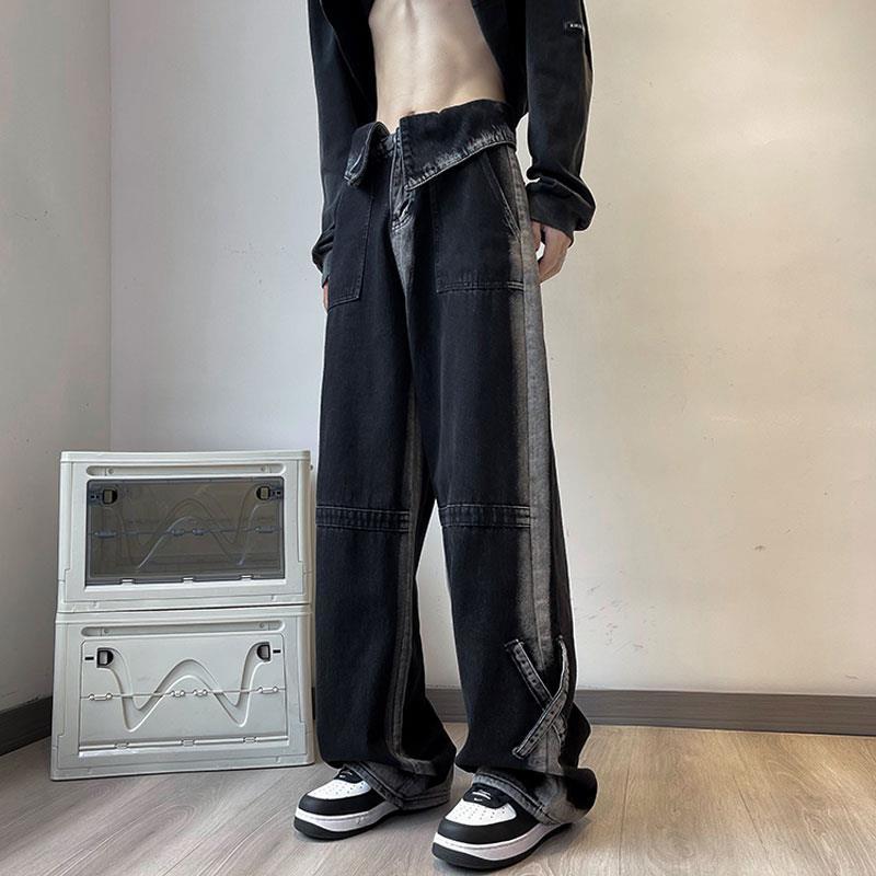 High Street Gradient American Wide Leg Jeans Men's Clothing Denim Pants Stylish Cross Spliced Vintage Young Style Loose Trousers