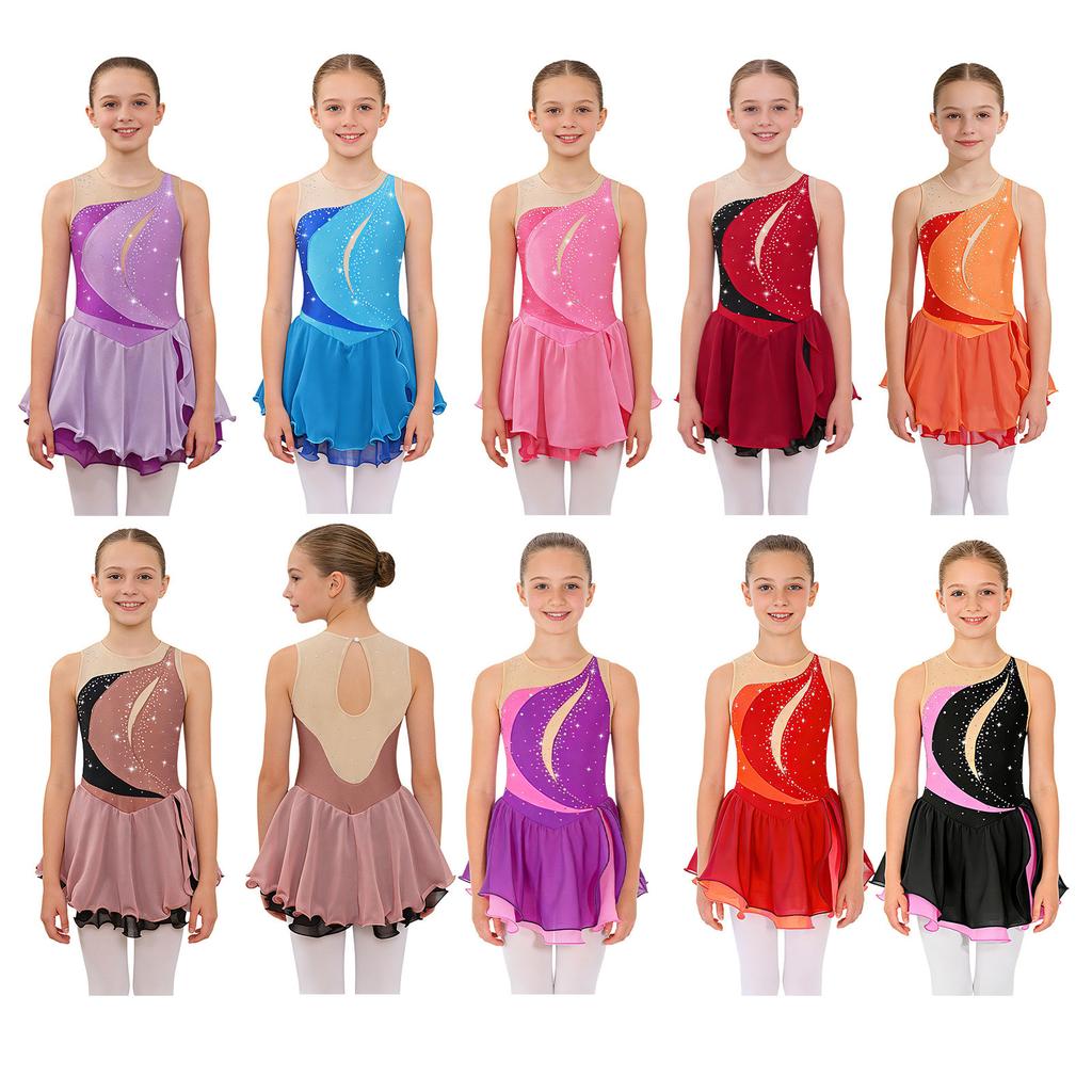 Kinder Mädchen Ärmelloses Eiskunstlaufkleid Glänzende Strass Ballett Gymnastik Tanz Trikot Bühnenkostüm