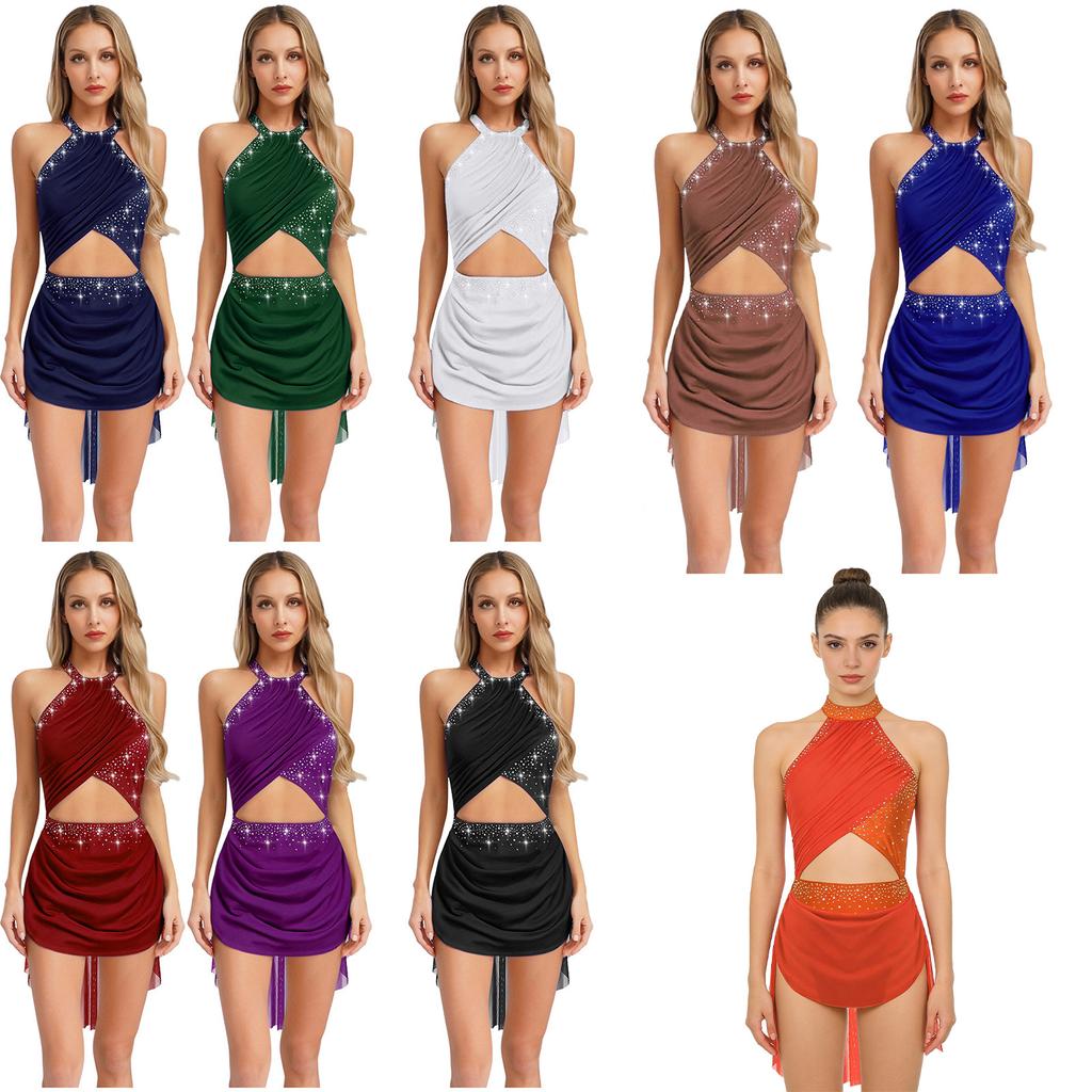 Modernes lateinamerikanisches Jazz-Lyrisches Samba-Tanzkleid für Erwachsene und Damen, Bühnenkostüm, Wettkampfkostüm, glitzernder Strass-Trikotrock