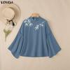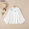 Merkmale:Maßgeschneiderte Langarm-Pulloverbluse mit Stehkragen, Knopfleiste hinten, Bambusblatt-Stickerei, Rüschenbesatz und ausgestelltem Ärmelabschluss