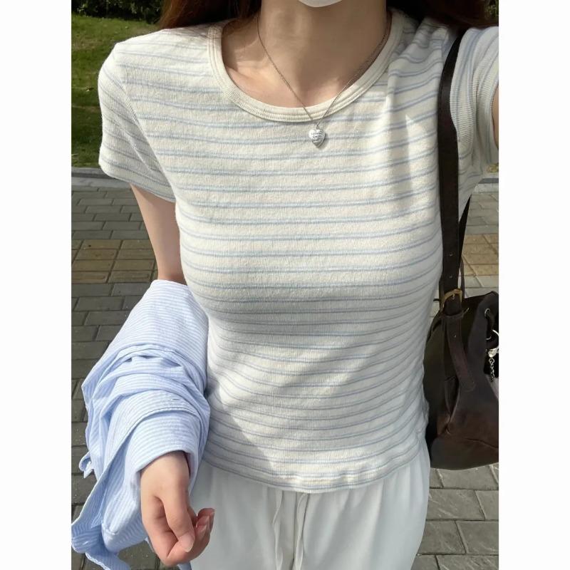 Koreanisches kurzärmeliges T-Shirt mit blauen Streifen für Damen, Neu, Slim Fit, Reine Baumwolle, Schlank, Süß, Modisch und altersreduzierend, Oberteil