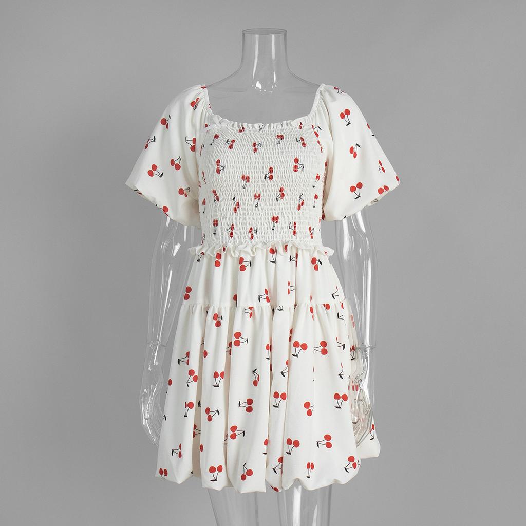 Square neck bubble sleeve dress, new waist skirt in summer in Europe and America, printed short dress