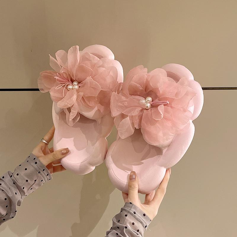 Perlenblumen-Flats Damenmode Runde Spitze Offene Zehenpartie Weiche Sohle Rutschfest und Verschleißfest Mittelhohe Hausschuhe