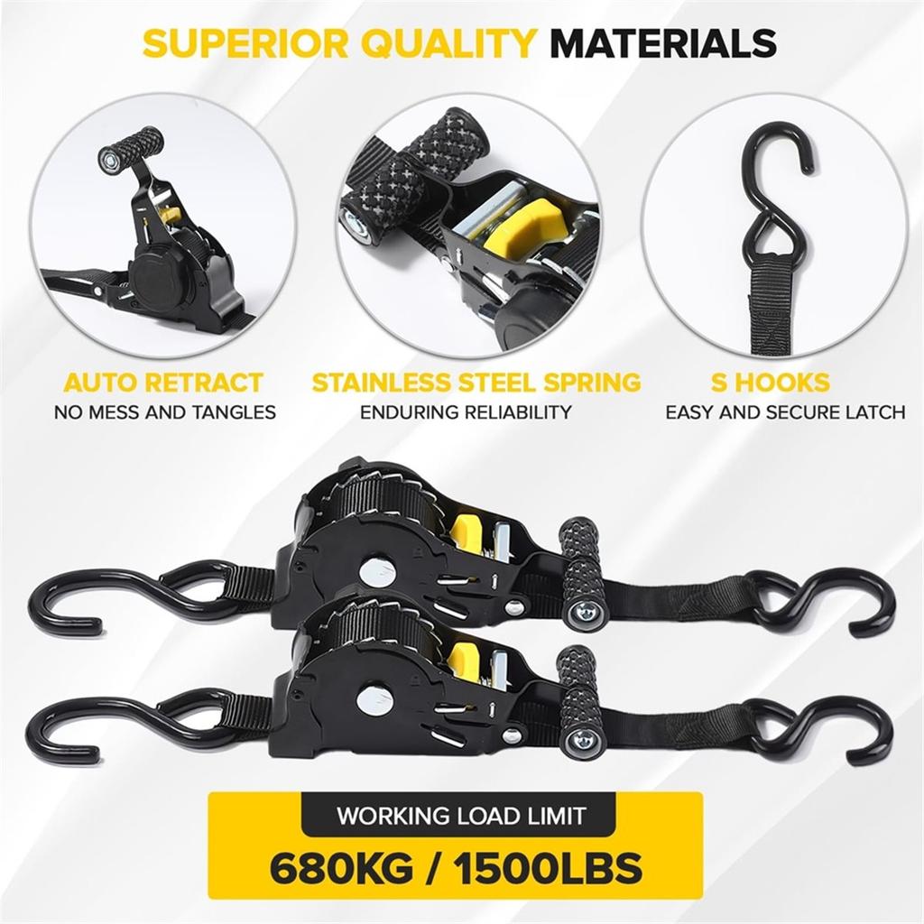 2Pcs Retractable Ratchet Tie Down Straps - 680kg Guaranteed Max Break Strength,Use for Boat, Securing Cargo