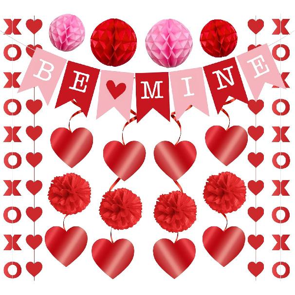 Complete Romantic Decor Set: This Valentine's Day party kit includes everything to create instant romance: 1 BE MINE banner (8.2ft), 8 glossy heart swirls, 4 honeycomb balls (6"+8"), 2 XOXO garlands, 2 heart garlands, and 4 jumbo paper pom poms. Perfect for transforming walls, ceilings, or photo backdrops into love-filled spaces.