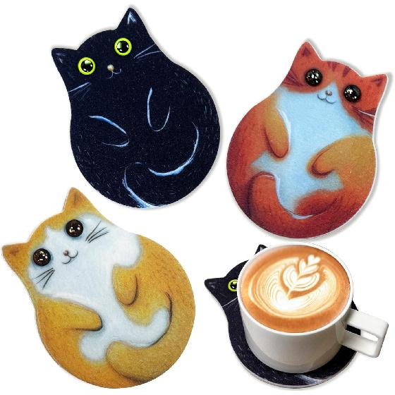 3-Pack Cat Coasters with Holder, Absorbent Felt Coasters with 3 Unique Cat Designs, Non-Slip Scratch Protection for Table, Washable Rustic Coaster