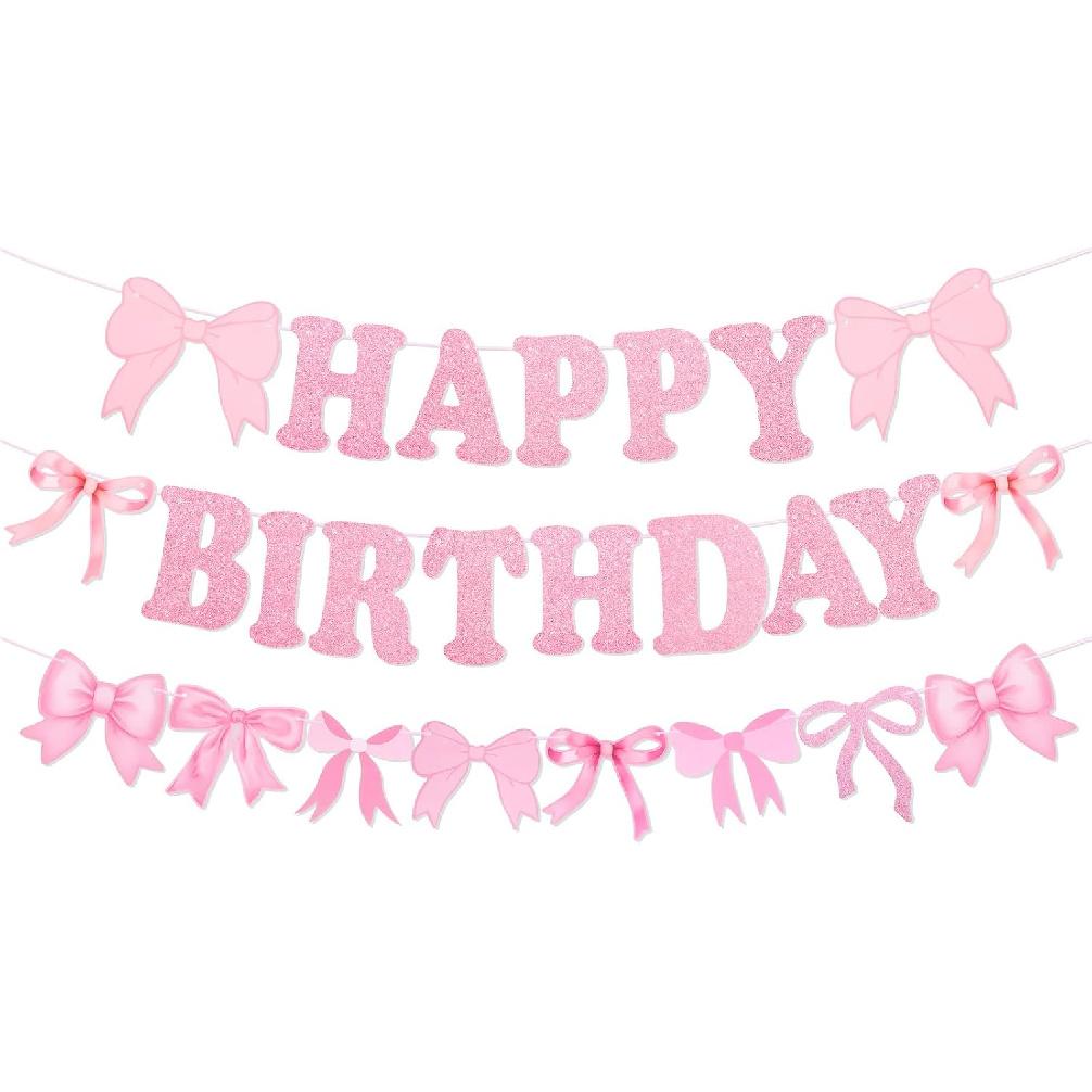 Pink Happy Birthday Banner, Bow Themed Party Decorations Hanging Set Pink Bowes Banner for Women Party Decorations