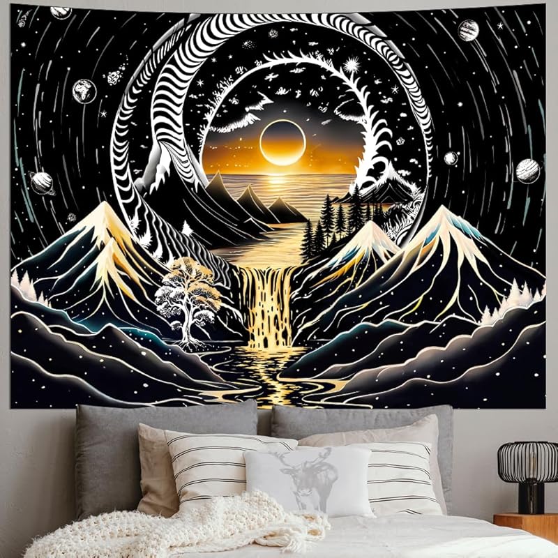 Amhokhui Black and White Tapestry Sun Mountain Tapestry Starry Night Aesthetic Tapestries Trippy River Landscape Tapestries Dark Wall Hanging Decor