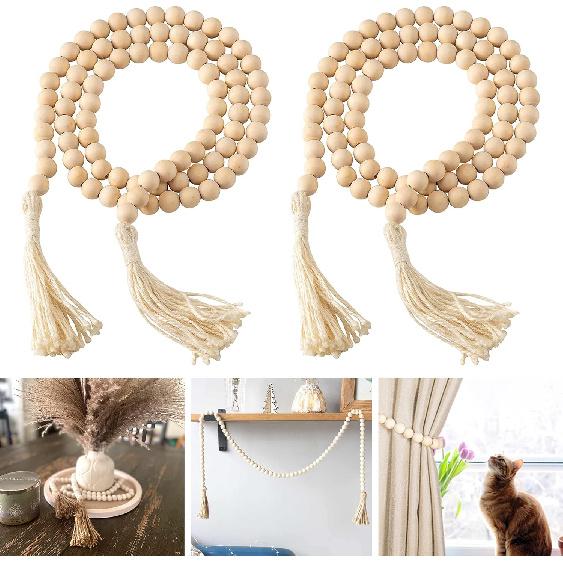 DECORKEY Farmhouse Wood Beads Garland, 2 Pack 58 Inch Wooden Beads for Boho Home Decor with Tassels, Rustic Country Decor for Coffee Table, Wall,
